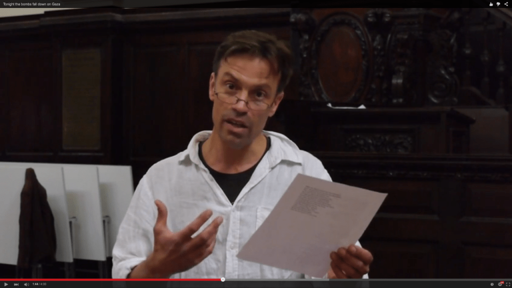 Playwright, actor and director Justin Butcher reads ‘Tonight the bombs fall down on Gaza’.