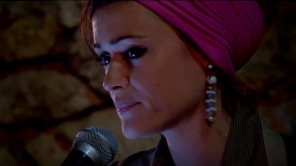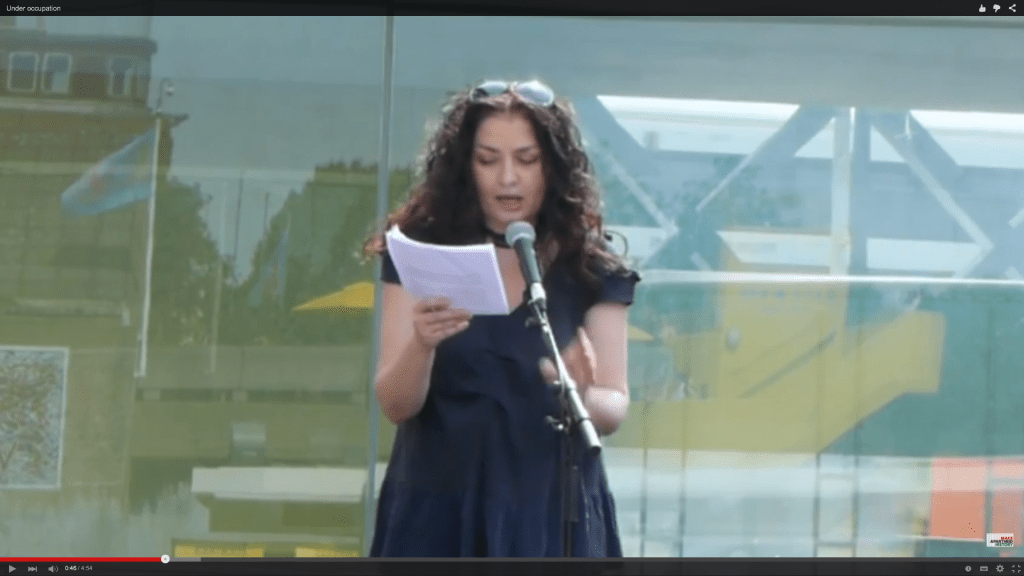 Palestinian film director Leila Sansour reads from one of her articles about life under occupation. Mandela Festival, Southbank Centre, London 2015.