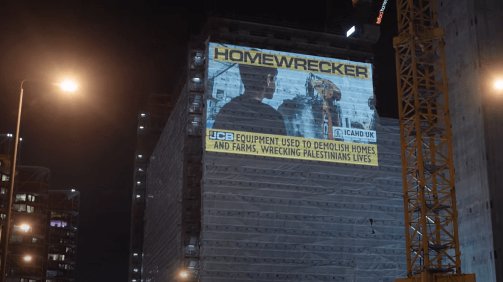 ICAHD UK – London wall projection about JCB bulldozers